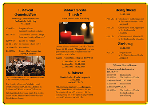 Andachten und Gottesdienste in der Advent- und WeihnachtszeitWir haben für Sie ein kleines Päckchen an Veranstaltungshinweisen rund um die Advents- und Weihnachtszeit geschnürt. Wir freuen uns, wenn wir Sie in der einen oder anderen Veranstaltung oder in den Gottesdiensten sehen. Der Flyer (Download hier) informiert Sie über das Gemeindefest am 1. Advent und unsere Wochenandachten „7 nach 7“, die mit einem musikalisch besonderen Gottesdienst am 4. Advent enden. Auch die Gottesdienste von Heilig Abend bis zum Neujahrsfest sind mit verzeichnet. Wenn Sie von zu Hause abgeholt werden wollen oder eine Mitfahrgelegenheit brauchen, wenden Sie sich bitte an das Evangelische Pfarramt |