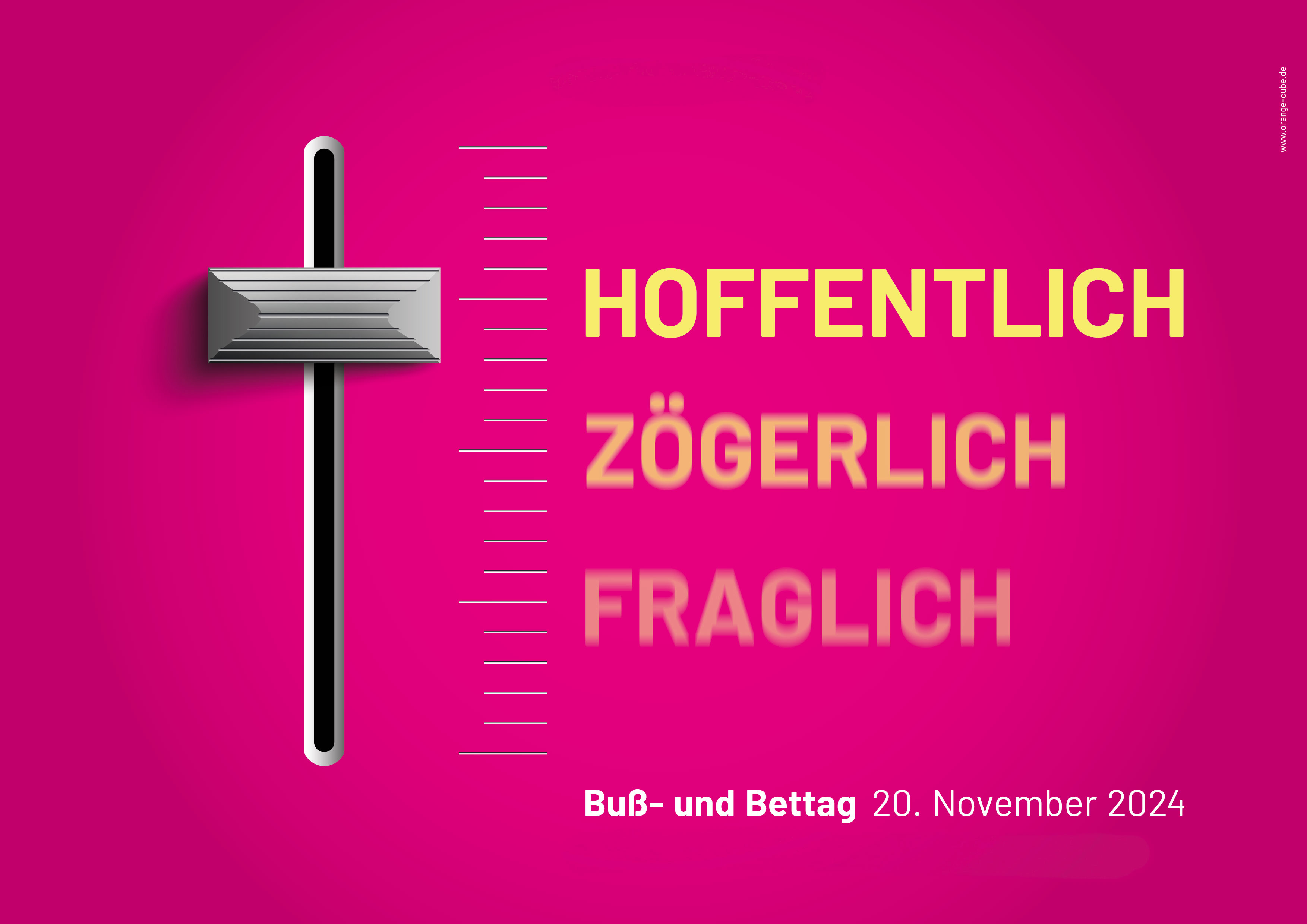 Gottesdienst am Buß- und Bettag mit Feier der Beichte und Abendmahl![]() Unter dem Thema "HOFFENTLICH“ steht der diesjährige Gottesdienst zum Buß- und Bettag, den wir am Mittwoch, den 20. November um 19:00 Uhr in der Martin-Luther-Kirche in Langquaid feiern. Wie oft beginnt ein Stoßgebet mit dem Wort „Hoffentlich“? Ob es laut erklingt, leise geflüstert wird oder nur in Gedanken verhallt – stets trägt es die Wünsche und Sehnsüchte eines Augenblicks in sich. Der Buß- und Bettag lädt ein, solchen „Hoffentlich“-Momenten nachzuspüren. Und er fragt nach unserem Anteil, dass die Hoffnung Erfüllung findet. |