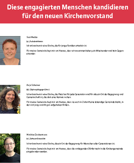 Nach Ablauf der Einspruchsfrist am 4. November wird das neu gewählte Gremium noch zwei weitere Gemeindeglieder in den Vorstand berufen. Die Einführung und Verpflichtung der gewählten bzw. berufenen Kirchenvorstände wird am 1. Advent im Rahmen des Gemeindefestes stattfinden. Unsere Kandidatinnen und Kandidaten für die KV-Wahl 2024Am Sonntag, den 20. Oktober wird unser neuer Kirchenvorstand gewählt. Die Briefwahlunterlagen wurden Ihnen bereits postalisch zugesendet. Durch Klicken auf das Bild erfahren Sie mehr über die Damen und Herren, die für das Amt des Kirchenvorstands kandidieren. |
