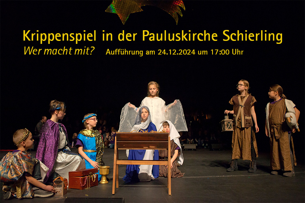 Krippenspiel-Kinder gesucht![]() Bald ist es wieder soweit: Am Heiligabend möchten wir in der Pauluskirche in Schierling wieder ein Krippenspiel aufführen und suchen dafür noch begeisterte Kinder, die gerne mitmachen möchten. Wir freuen uns über Kinder, die gerne einen kleinen Text sprechen, aber auch über jene, die einfach nur auf der Bühne stehen und Teil der Geschichte sein möchten. Die Konfession spielt dabei keine Rolle. Die erste Probe findet am Freitag, den 22. November statt. Frau Metko wird ab 17:00 Uhr im Erweiterungsraum der Pauluskirche sein, um mit allen Interessierten die Rollen zu verteilen und erste Fragen zu klären. Von da an bis Weihnachten ist dann jeden Freitag Krippenspiel-Probe. Eine telefonische Voranmeldung im evangelischen Pfarramt (09451 1325) ist nicht notwendig, aber wünschenswert, damit bereits im Vorfeld ein passendes Stück ausgewählt werden kann. |