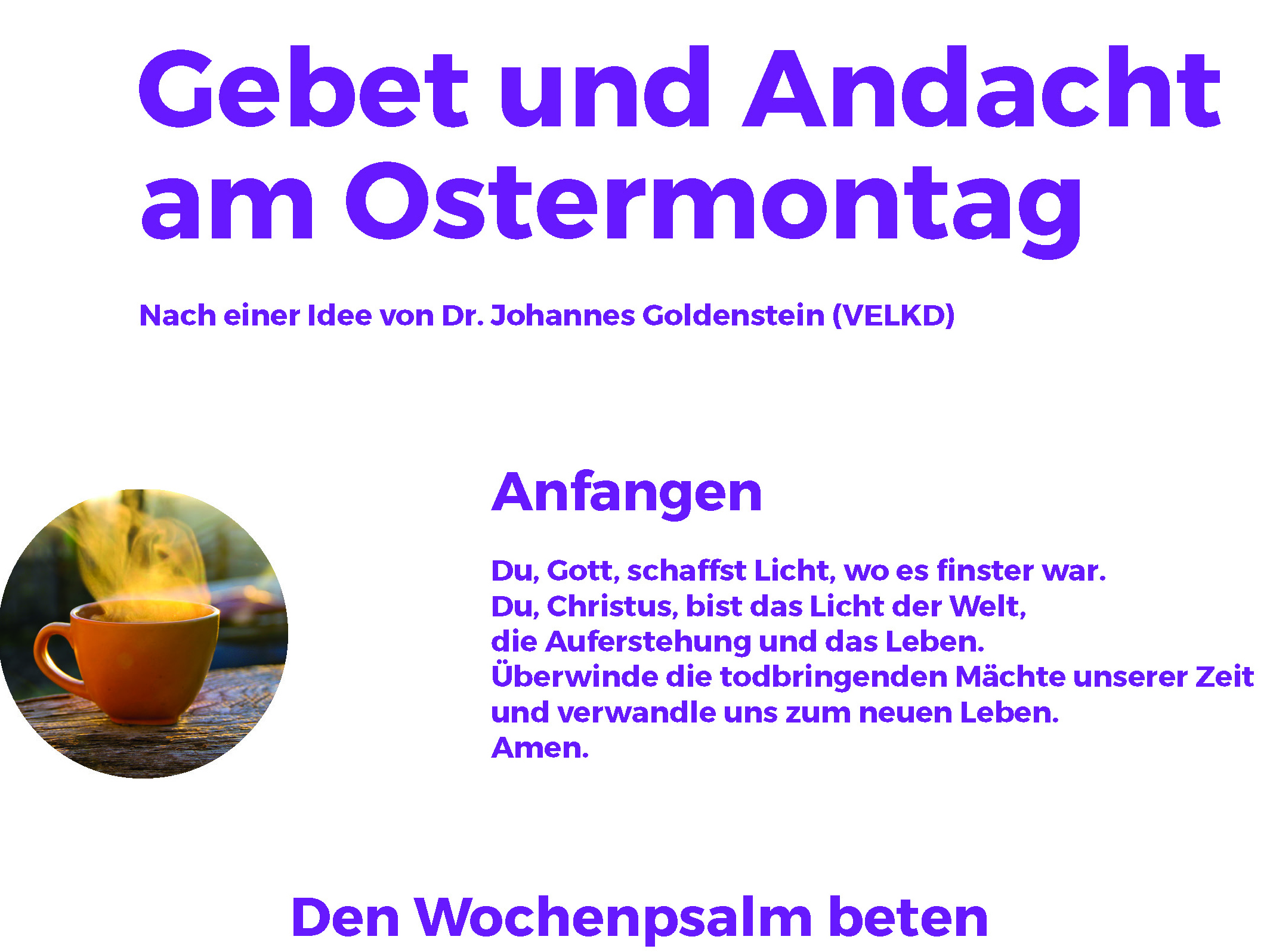 #hoffnungswege durch die Heilige WocheAuf der Website kirchenjahr-evangelisch.de (ein Angebot der ELKB und der VELKD) findet sich eine Aktion, die dazu einlädt, die Kar- und Osterwoche mit einem täglichen Impuls und "Arbeitsauftrag" zu einem Bibeltext zu begehen. Johannes Goldenstein hat die Impulse gestaltet, die auch zum Aufschreiben der Gedanken ausdruckbar sind. directlink: https://www.kirchenjahr-evangelisch.de/hoffnungswege.php |