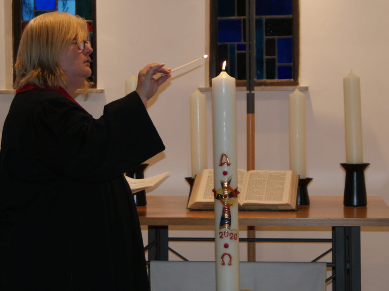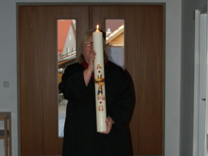 Hier sind Bilder vom Einzug der Osterkerze, dem Exsultet und der symbolischen Lichtausbreitung aus der Martin-Luther-Kirche in Langquaid |
