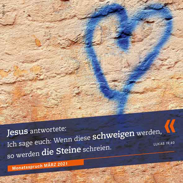 Gedanken zum Monatsspruch: Verschweigen nützt nichtsIch sehe Steine und Gedenksteine vor mir. Ganz verwischt sind sie. Ich brauche Hilfe, um zu erfahren, was hier einstmals stand und zu lesen war. Noch gibt es Menschen, die die Geschichte kennen und Geschichten erzählen können. Wir sind in der Passionszeit. Die Bibel erzählt, dass Jesus auf einem Esel reitend in Jerusalem einzieht. Sie begrüßen ihn als den neuen König, der im Namen Gottes Frieden bringt. Pharisäer betrachten diese Verehrung, diese Hoffnungsrufe mit Argwohn. Der da kann die bekannte Ordnung zum Wanken bringen. Die Aufforderung an Jesus, die Menge doch zum Schweigen zu bringen, beantwortet Jesus mit dem Satz: „Ich sage euch: Wenn diese schweigen werden, so werden die Steine schreien.“ Selbst wenn Menschen geschichtsvergessen Parolen schreien und Geschehenes und Zusammenhänge leugnen, alternative Fakten zu schaffen versuchen, Fake News skandieren, die Hoffnung auf eine friedliche Welt, auf Gerechtigkeit und Bewahrung der Schöpfung ist nun einmal in dieser Welt. Menschen, die für Frieden und Gerechtigkeit, die Bewahrung der Schöpfung eintreten, müssen einen langen Atem haben. Manches, was auf unserer Erde passiert, schreit zum Himmel. Verschweigen nützt nichts, vertuschen, zerstören bringt nichts – es gibt Zeugen und Zeugnisse, die sich nicht zum Schweigen bringen lassen. (Carmen Jäger) "Tipp" für die Fastenzeit :) |